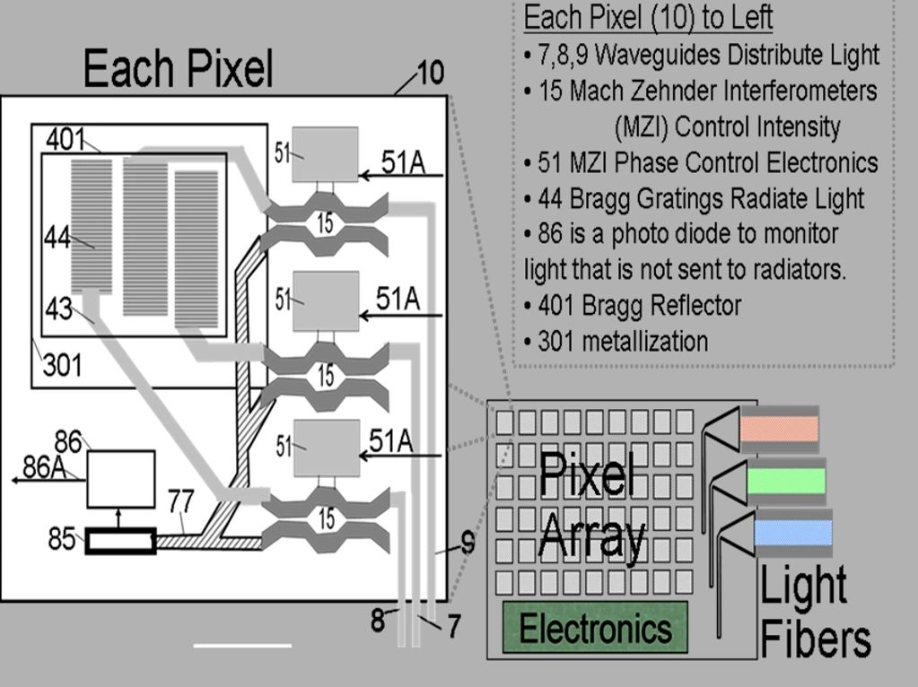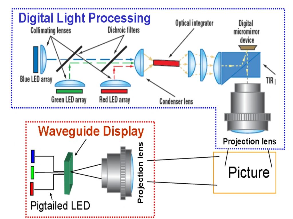 The figure at right compares the construction of a Waveguide Display projector with construction of a Texas Instruments Digital Light Processing projector. The WD requires only fiber coupled light and a lens, whereas the DLP requires a more complicated design. Further, the WD is much faster than DLP.